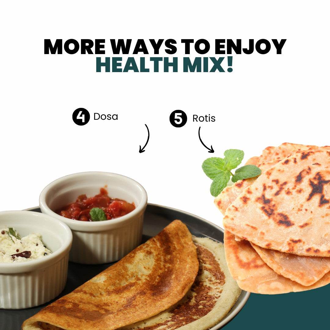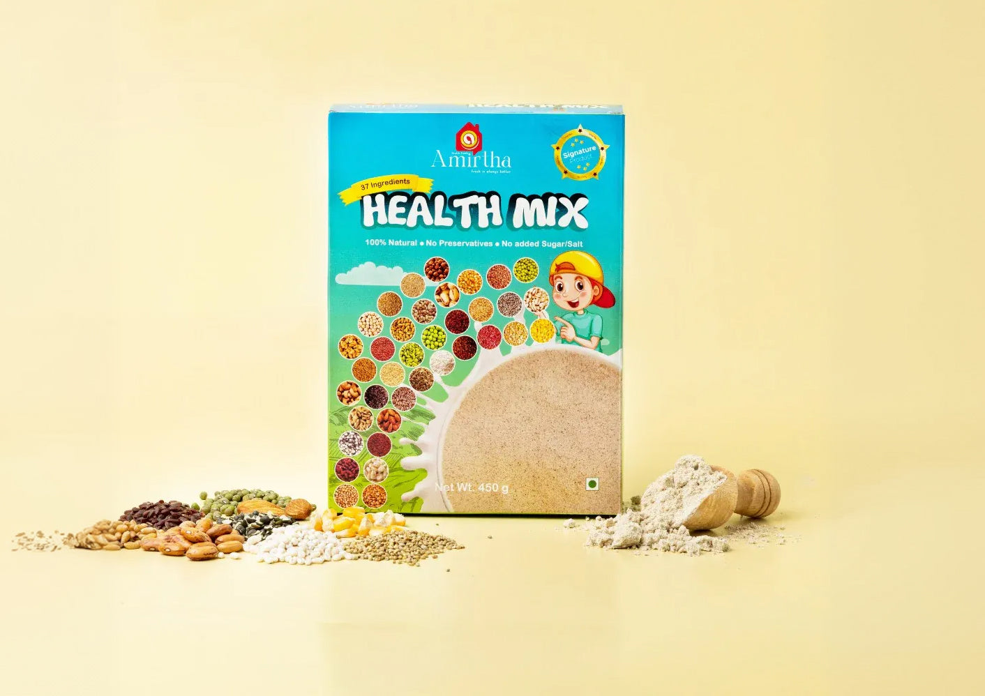 37 Ingredient Health Mix - Packed with the power of 37 nutrient-rich ingredients, this signature Amirtha mix is ideal for all ages above 7 months. Loaded with protein, calcium, and iron, it supports daily nutrition naturally. 100% clean—no refined sugar, salt, maida, milk solids, artificial flavours, colours, or preservatives.