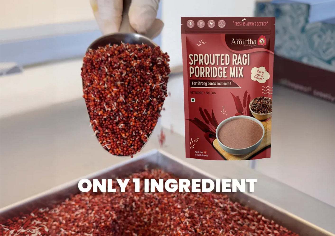 Cocoa Sprouted Ragi Almond Drink Mix - Mix with hot milk for a nourishing treat! This Cocoa Sprouted Ragi Almond Drink is perfect for kids 1 year+ and loved by all ages. Rich in calcium and antioxidants, it supports strong bones and overall wellness. No refined sugar, salt, maida, milk solids, artificial flavours, or preservatives.