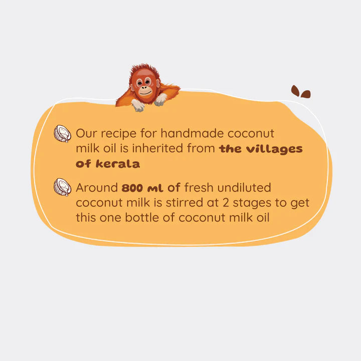India's first baby massage oil from fresh Kerala coconut milk—single-ingredient purity. Hand-stirred from 800ml thick first-press milk, fermented & slow-cooked in bronze vessels to yield 100ml potent oil. 49% Lauric Acid (like mother's milk) strengthens skin barrier, locks moisture, eases irritation. Medium-chain fatty acids balance & repair. Fast-absorbing, non-sticky with mesmerizing coconut aroma. No additives—generations-tested care for dryness, rough patches & redness.