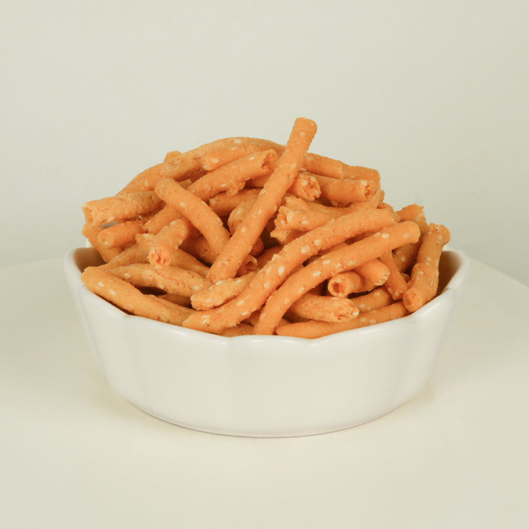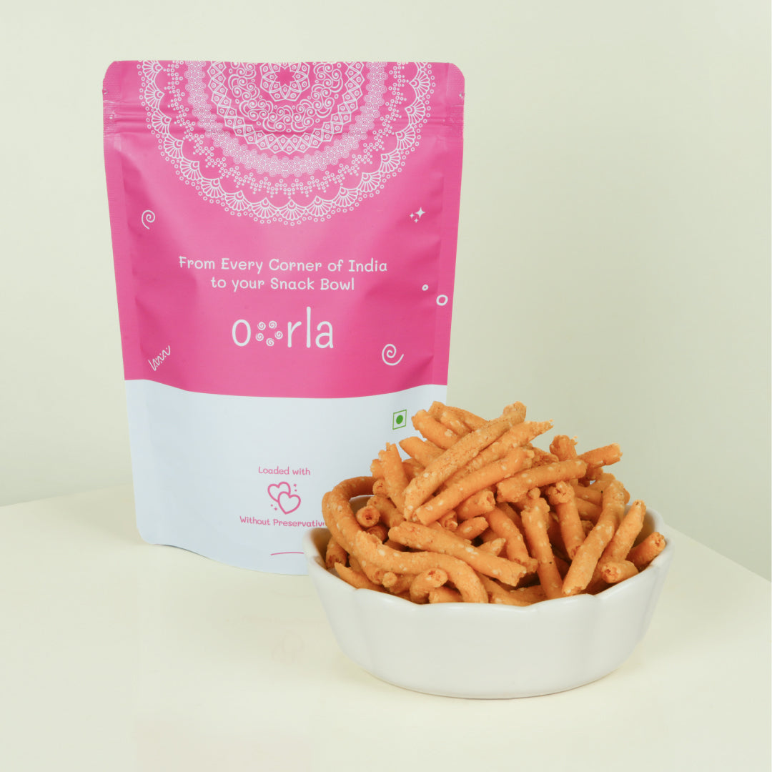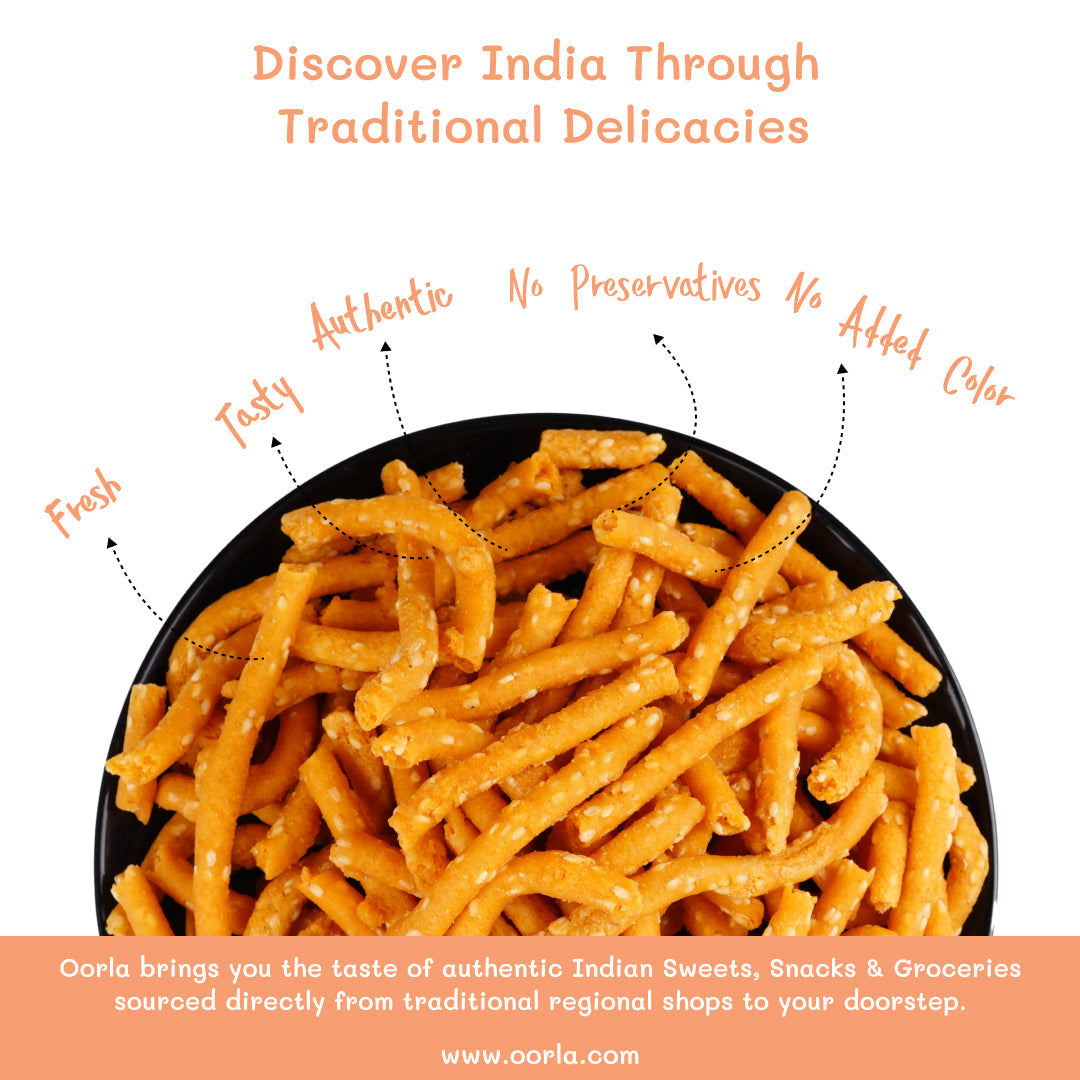 Ellu Murukku is a crispy, twisted snack made with rice flour, sesame seeds, and aromatic spices for a nutty, savoury flavour. Perfect for tea-time or anytime snacking, this traditional Tamil Nadu delicacy offers the perfect crunch with every bite. Handcrafted using authentic ingredients, it’s a must-have treat for lovers of traditional Indian snacks. Enjoy the wholesome taste of Ellu Murukku, made with care and tradition!