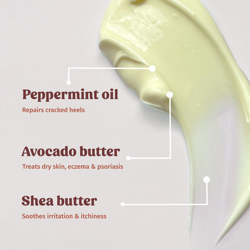 Foot Cream (Treats Cracked Heels) - Vilvah’s Foot Cream blends Peppermint, Argan Oil, Kalonji Oil, and rich Avocado, Shea, and Mango butters to deeply hydrate and repair cracked heels. It softens rough skin, soothes tired feet, and leaves them smooth, refreshed, and rejuvenated.