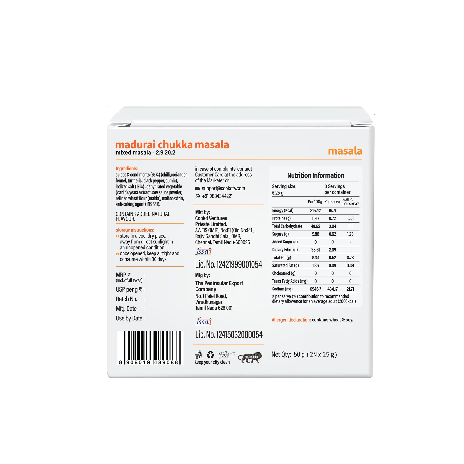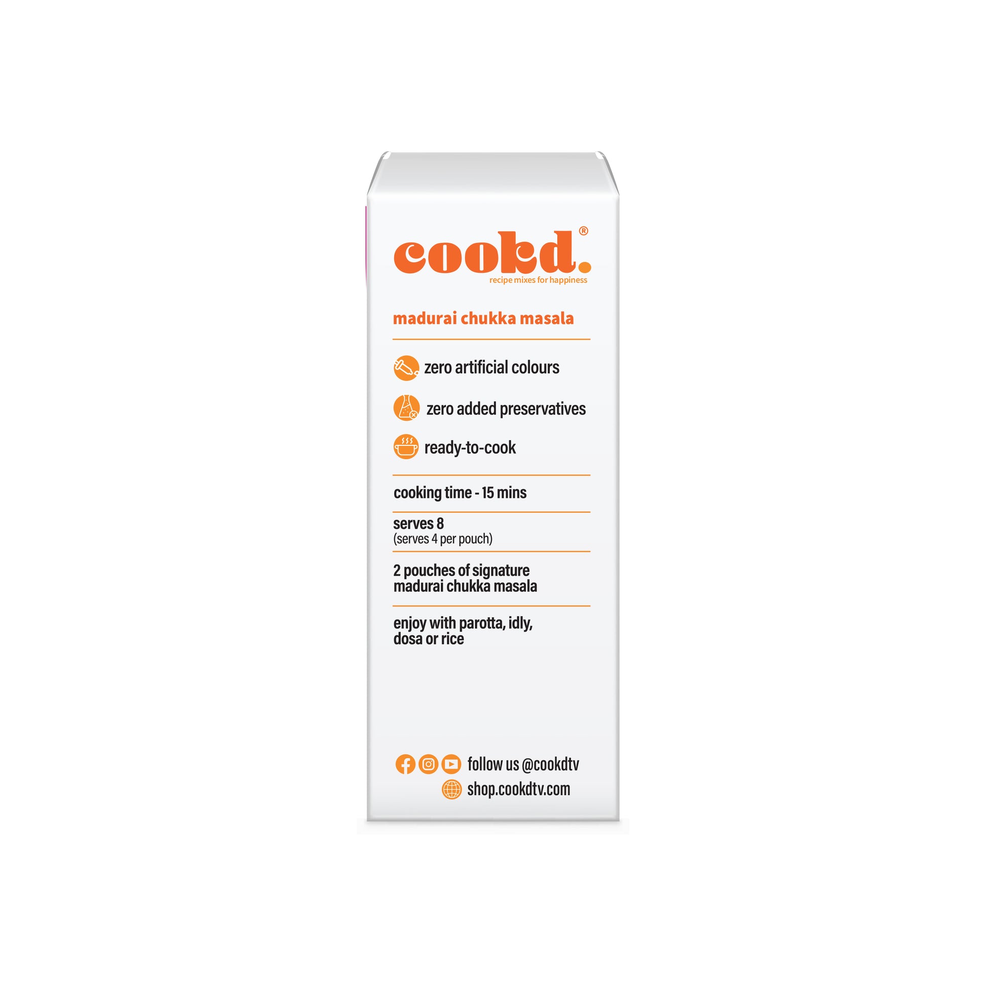 Madurai Chukka Masala - Cookd Madurai Chukka Masala blends the perfect mix of roasted spices, red chillies, pepper, fennel, and aromatic herbs to recreate the bold Madurai-style chukka flavour. Pre-measured, balanced, and full of punch authentic Madurai chukka made effortlessly at home.