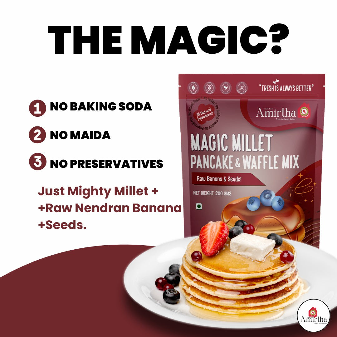 Magic Millet Pancake Mix - Make healthy meals in minutes with Magic Millet Pancakes—perfect for ages 1+ and all age groups. Enriched with raw Nendran banana, these 5-minute pancakes are rich in fiber, omega-3, calcium, iron, magnesium, and potassium. No baking soda, salt, refined sugar, maida, milk solids, or preservatives.
