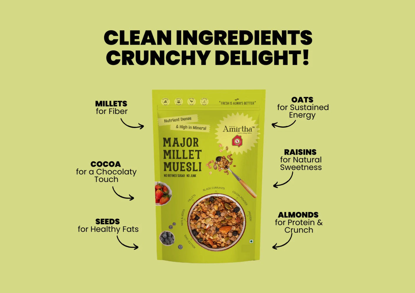 Major Millet Muesli - Enjoy the unforgettable crunch of Millet Flakes—perfect for kids 3+ and adults. Made from major millets flaked to perfection and mildly sweetened with jaggery. Nutritious, delicious, and 100% clean with no refined sugar, salt, maida, milk solids, artificial flavours, or colours.