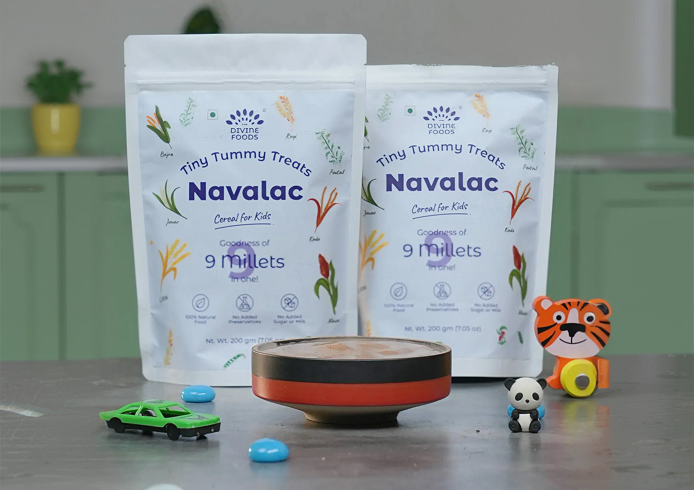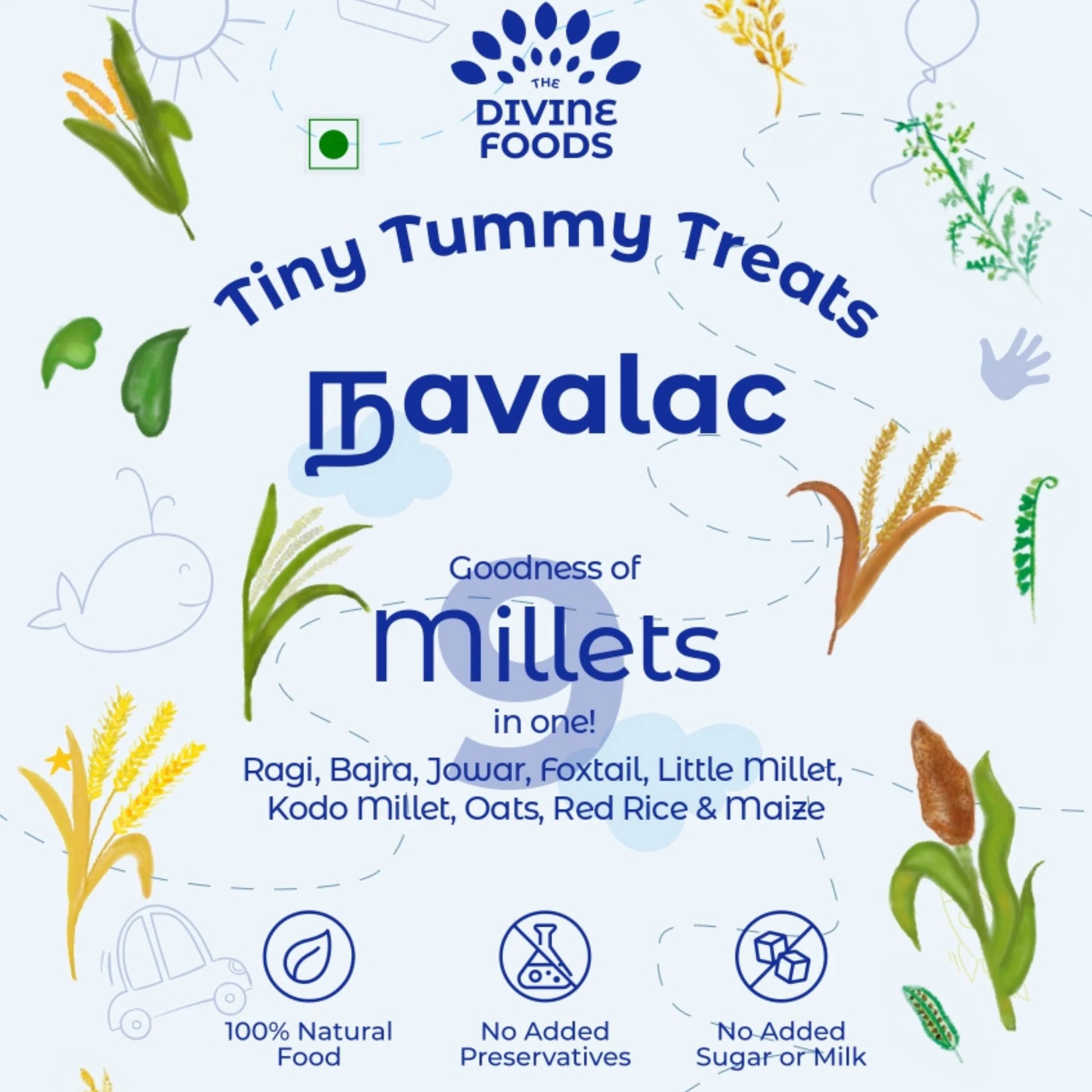 Divine Foods Navalac Mix combines the goodness of nine ancient grains—Ragi, Bajra, Jowar, Foxtail, Little Millet, Oats, Red Rice, Maize, and Kodo Millet. Rich in plant protein, fiber, antioxidants, and essential vitamins, it supports digestion, boosts energy, and promotes overall wellness. A wholesome, lactose-free nutrition drink.