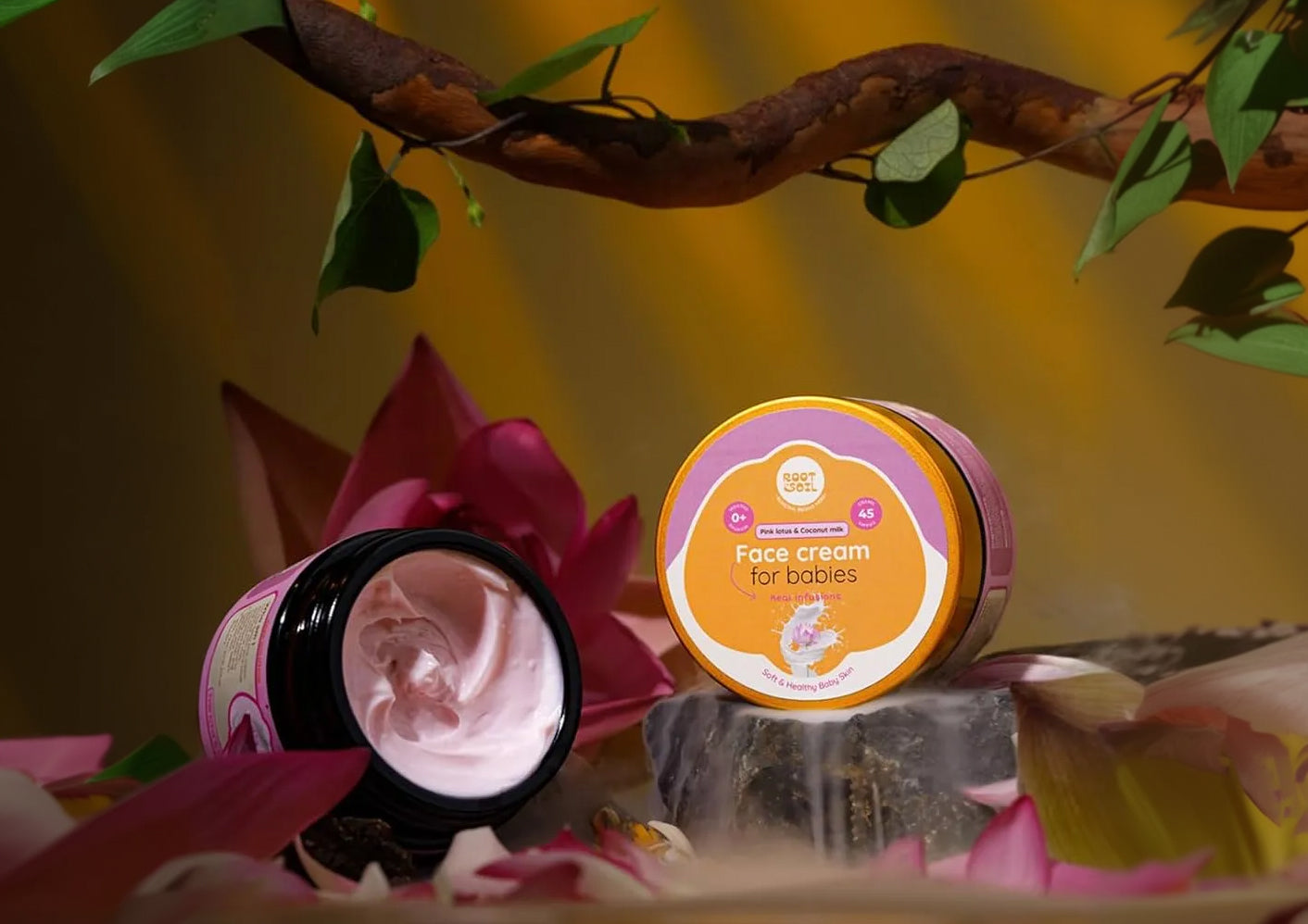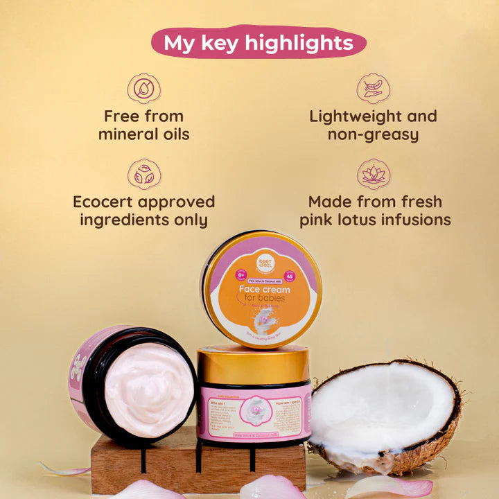 Root and Soil’s Pink Lotus & Coconut Milk Face Cream is a lightweight, deeply hydrating formula crafted for delicate baby skin. Enriched with pink lotus floral water, coconut milk oil, mango butter, and almond oil, it nourishes, softens, and supports radiant skin with a non-greasy finish. Gentle enough for daily use, it turns everyday care into a soothing ritual. Available on IndiThings.