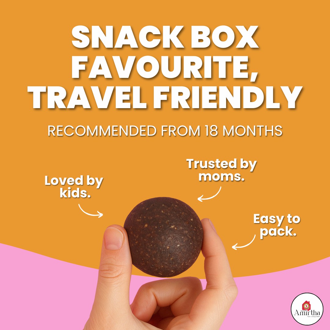 Sprouted Ragi & Dry Fruits Ladoos - Enjoy a fulfilling bite with Sprouted Ragi & Dry Fruits Ladoo—perfect for ages 18 months and above. Made with millets, nuts, and seeds, it’s rich in calcium and iron to help boost hemoglobin. 100% clean with no refined sugar, maida, or artificial flavours. Freshly made, preservative-free.