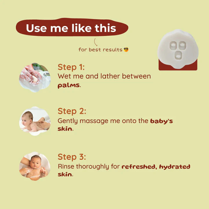 Root and Soil’s Tender Coconut Bathing Bar is crafted with a unique 4X coconut formulation that replaces water with coconut water for deep hydration. Enriched with coconut milk oil, cold-pressed coconut oil, almond oil, and castor oil, it gently cleanses while preventing dryness and supporting soft, balanced baby skin. Free from chemical fillers and tear-free agents. Available on IndiThings.